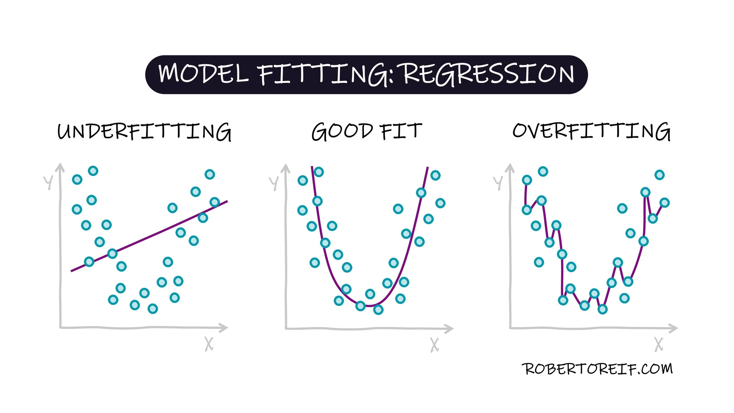 When fitting regression models to predict continuous variables, we often face challenges with underfitting and overfitting. Underfitting occurs when the model is too simple and fails to capture the underlying patterns in the data. On the other hand, overfitting happens when the model is overly complex, capturing intricate details of the training set but performing poorly on the testing set. Ideally, we aim for a balance—where the model generalizes well, capturing the overall trend in both the training and testing data.