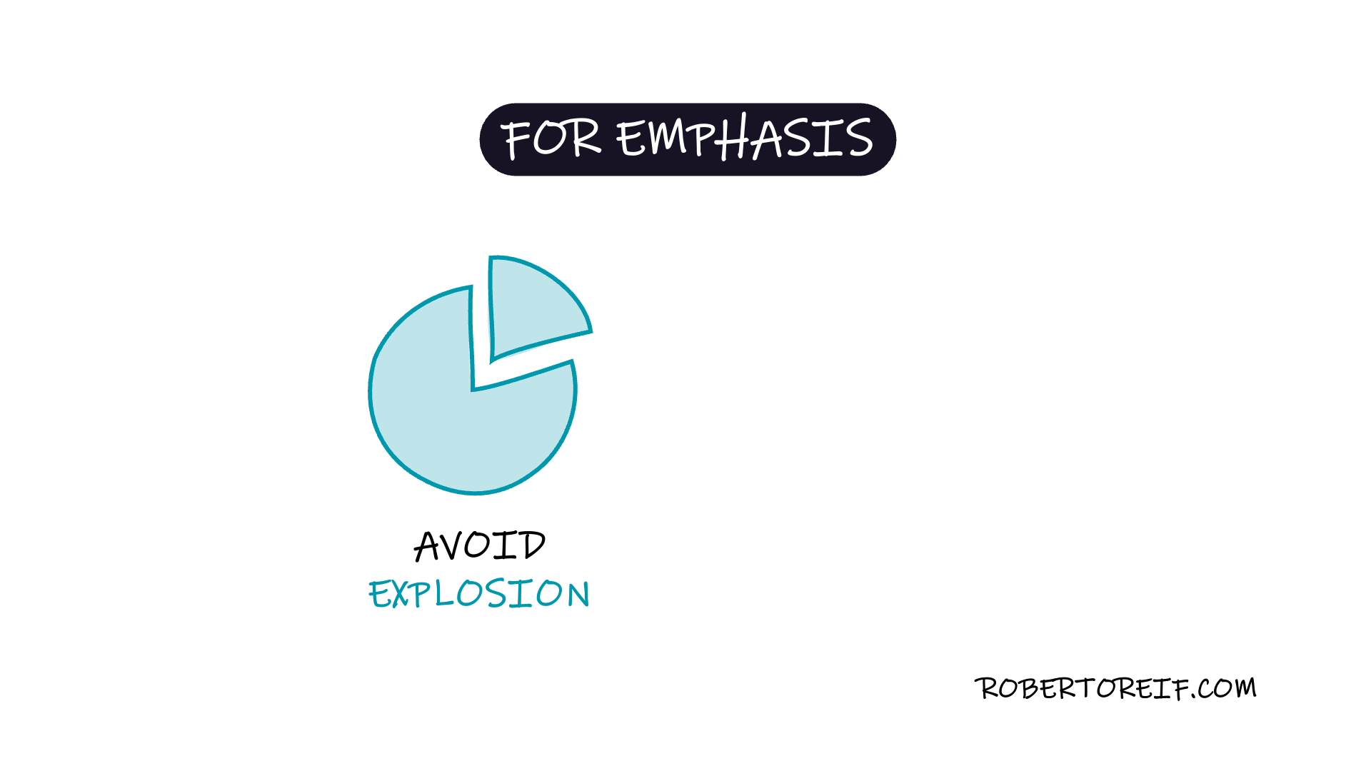 To emphasize key slices in pie charts, one option is explosion, which separates a slice from the rest of the chart. However, this can distort proportions, making comparisons difficult. A better approach is to use color highlights, preserving the chart's visual integrity while drawing attention effectively.